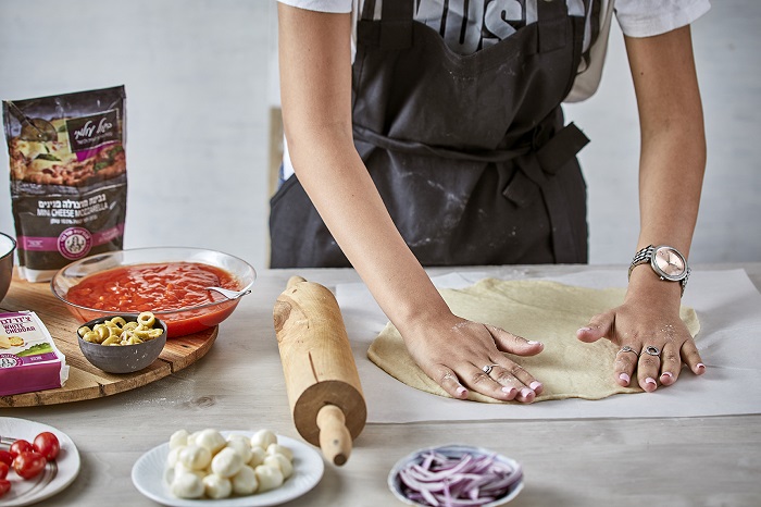– במרכז הפיצה מורחים רוטב עגבניות, מפזרים גבינת צ'דר ומעל מפזרים את התוספות שאוהבים.