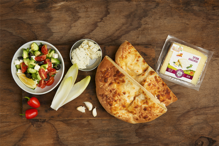 – מניחים בכל כדור בצק מ-2 סוגי הגבינות וסוגרים לצורת שק סגור. משטחים את הבצק לצורת פיתה שטוחה.
