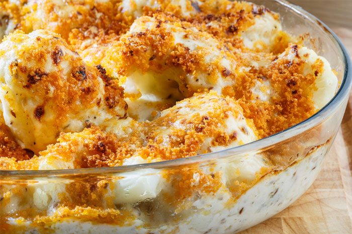 6. מפזרים מעל הכרובית את יתרת הגבינה ואת הפירורים בשמן ואופים כ-20 דקות עד להזהבה.